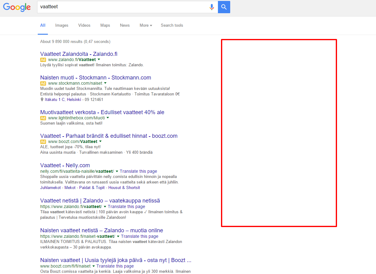 Suomessa tavallinen käyttäjä näkee oikeassa reunassa enää vain Googlen tietoiskuja (Knowledge Graph Boxes), joten hakusivusta tulee huomattavasti siistimpi. Todennäköisesti muutos nostaa Adwordsin keskimääräisiä klikkihintoja, koska kilpailu neljästä parhaasta mainospaikasta kovenee. Lisäksi Google määrittelee jatkossa mitkä haut ovat “highly commercial” eli ansaitsevat saada neljä mainospaikkaa yläreunaan.