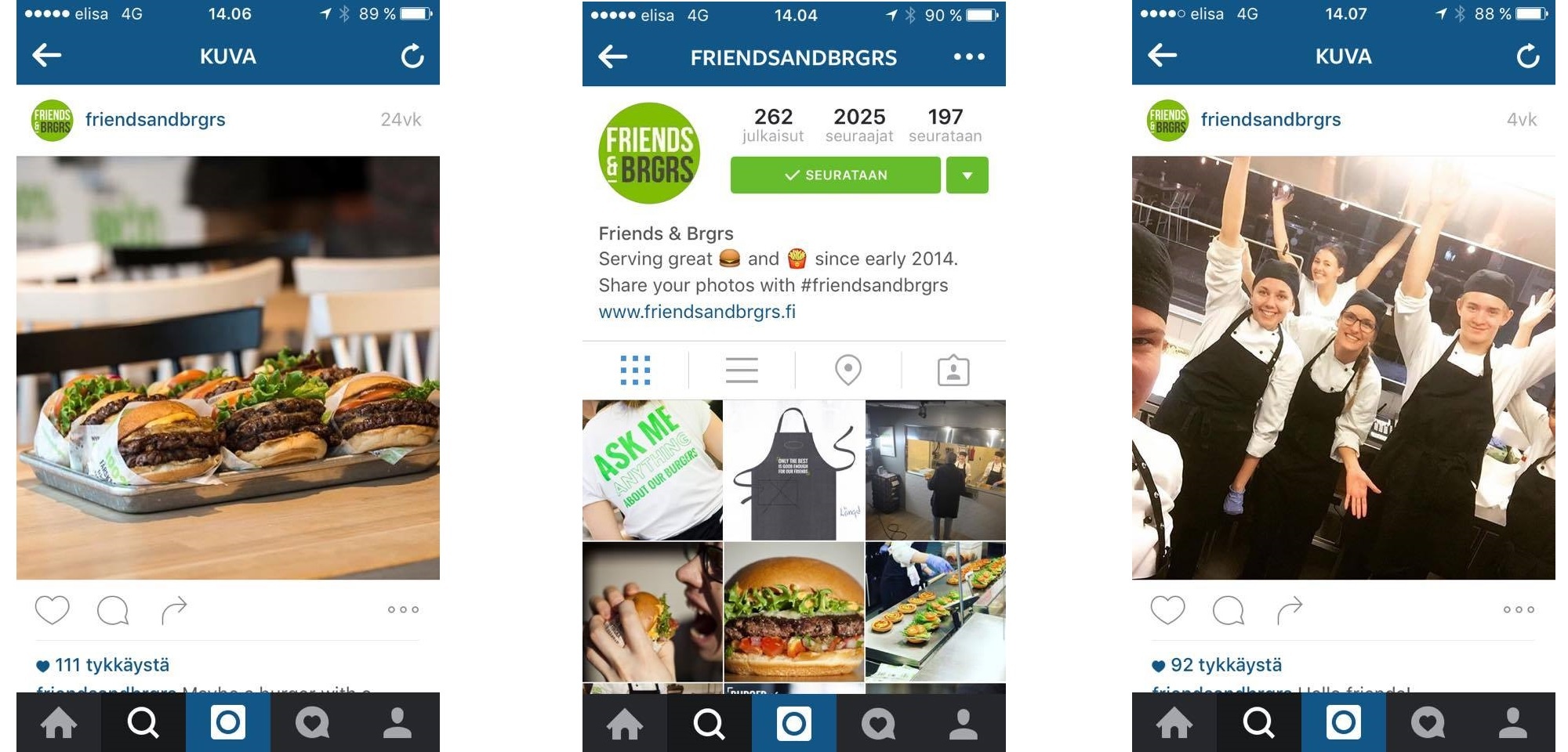 Friends & Brgrs on kasvanut Suomessa nopeasti yhdeksi puhutuimmista hampurilaisravintoloista jakamalla tarinaansa aktiivisesti Instagramissa ja muissa kanavissa. Kaikkihan pitävät hampurilaisista ja erityisesti tuoreista, paikallisista raaka-aineista tehdyistä hampurilaisista. Friends & Brgrs:in fanit ovat ladanneet Instagramiin tuhansia kuvia, joiden kautta Friends & Brgrs on tavoittanut jo satoja tuhansia nuoria. Instagram on otettu huomioon brändäyksessä ja pakkaussuunnittelussa niin hyvin kuin mahdollista. Esimerkiksi ravintoloiden seinälaatat on valittu kuvaukseen sopiviksi, pakkaukset sisältävät lyhyitä brändiviestejä ja niistä löytyy myös #friendsandbrgrs -hashtagi.