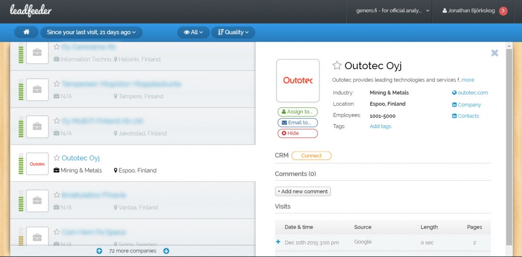 Kaiken tämän datan saa myös Google Analyticsista suodattamalla pois internet-palveluntarjoajat ja segmentoimalla dataa, mutta tämän työkalun ansiosta sitä vaivaa ei tarvitse nähdä. Avaat vain Leadfeederin ja näet liidit helposti ja selkeästi. Voit tehdä liideille toimenpiteitä, palata jälleen katsomaan listaa muutaman päivän kuluttua ja toistaa tätä säännöllisesti. Yksi Leadfeederin parhaimmista eduista on se, että työkalu hyödyntää Google Analytics dataa eikä vaadi erillisen koodin asentamista sivuillesi. Näin voit selata työkalun avulla myös aiemmin kerätystä datasta generoituja liidejä.
