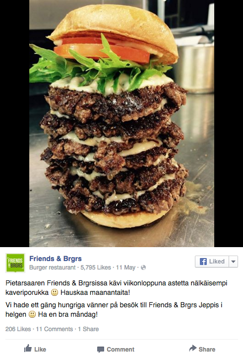 Friends & Brgrsilla on ollut alusta asti selvää, että fanien kanssa jaetaan ilot ja surut. Tästä esimerkkinä Pietarsaaren ravintolassa valmistettu SM-tason burgeri.