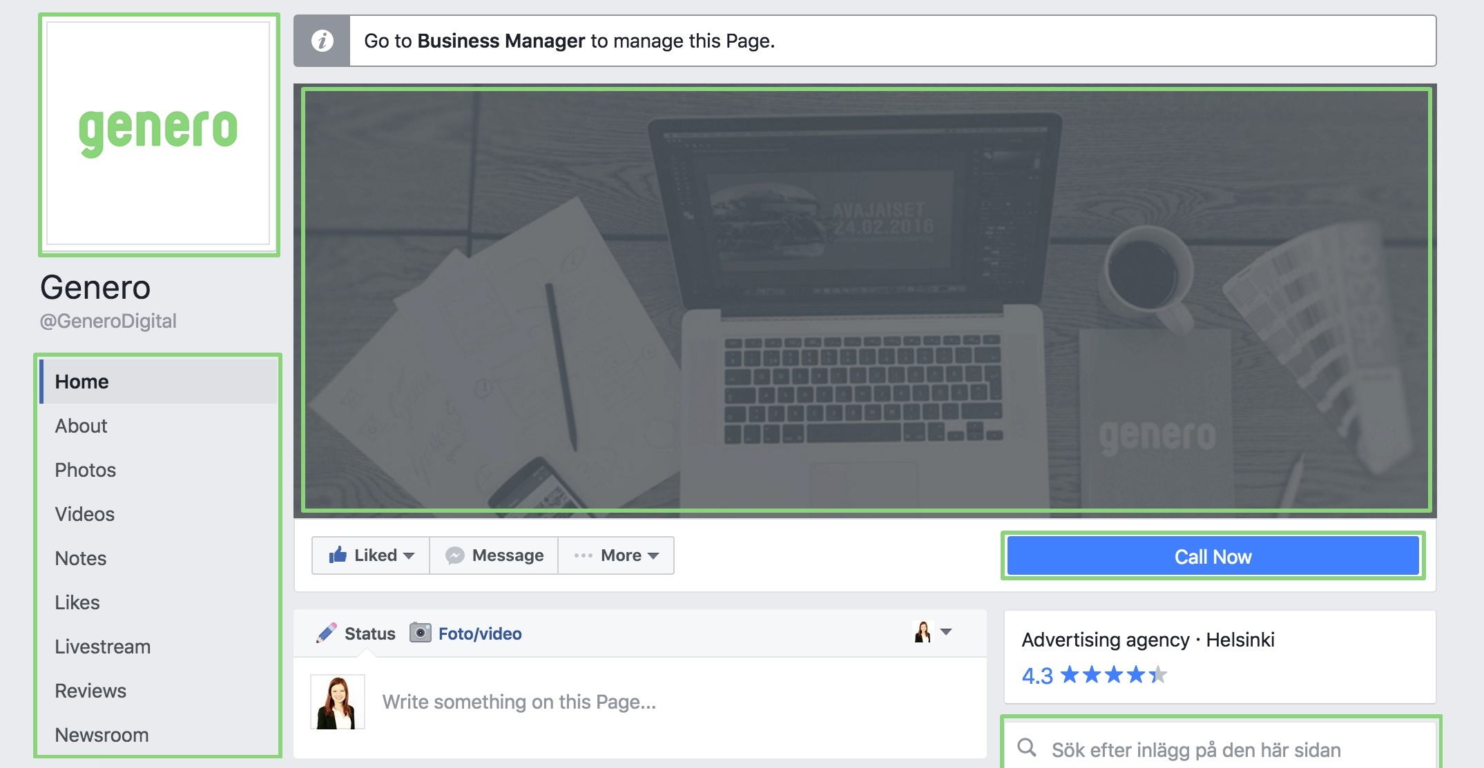 Näetkö sinisen ”Call Now” -nappulan? Facebook on tehnyt toimintakehotukset selkeämmiksi suurentamalla painikkeita. Itse kehotusta voi säätää yrityksen tavoitteiden mukaan, joten painikkeella voi kehottaa esimerkiksi tilaamaan uutiskirjeen, pelaamaan peliä, rekisteröitymään tai lataamaan sovelluksen.