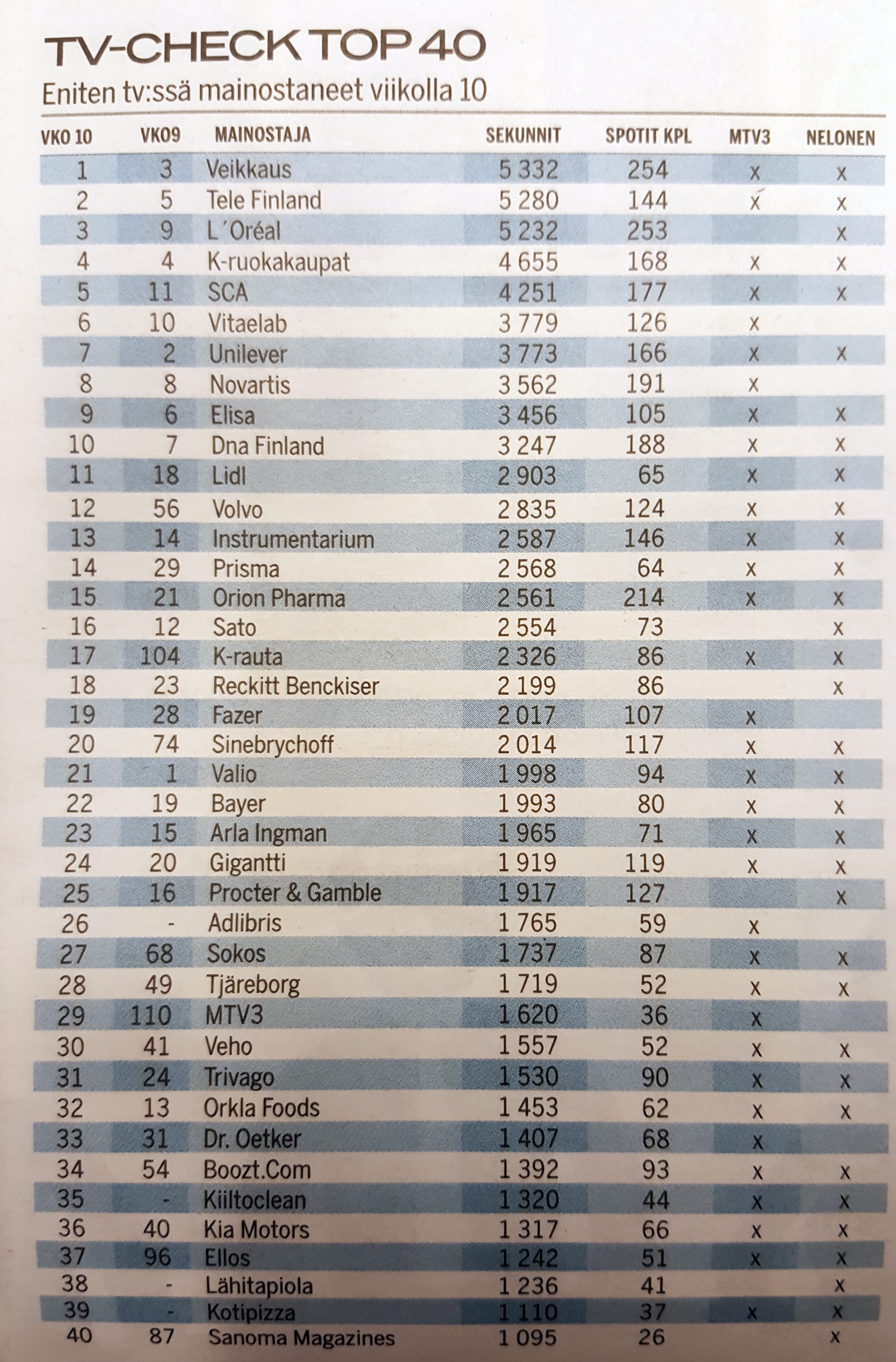 Lista näyttää melko samanlaiselta kuin aiemmin, booking.com on kärjessä ja suurimmat mainostajat ovat matkailualan yrityksiä. Jos vertailee AdWords-mainostajien listaa TV-mainostajien listaan, nämä eivät korreloi keskenään aivan täysin.