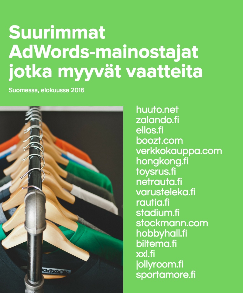 Teemme kuukausittain pienen analyysin Suomen suurimmista AdWords-mainostajista (Katso joka kuukauden suurimmat mainostajat tästä). Listalla on 100 sivustoa, jotka käyttivät eniten rahaa AdWords-mainontaan elokuussa 2016. Tällä kertaa analysoimme myös erityisesti sivustoja, jotka myyvät vaatteita.